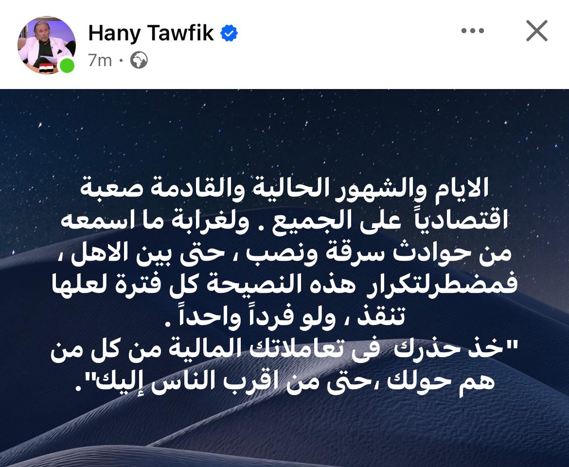 وفي منشوره على موقع التواصل الاجتماعي “فيسبوك”، قال توفيق: “الأيام والشهور الحالية والقادمة صعبة اقتصادياً على الجميع ، ولغرابة ما أسمعه من حوادث سرقة ونصب، حتى بين الأهل، فمضطر لتكرار هذه النصيحة كل فترة لعلها تنقذ ، ولو فرداً واحداً.. خذ حذرك في تعاملاتك المالية من كل من هم حولك، حتى من اقرب الناس إليك”.