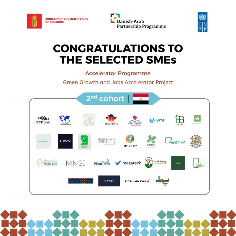 يُعد مشروع “تسريع النمو الأخضر وتوفير الوظائف” جزءاً من برنامج الشراكة الدنماركية-العربية (DAPP) التابع لوزارة الخارجية الدنماركية، ويتم تنفيذه بالتعاون مع برنامج الأمم المتحدة الإنمائي (UNDP) بالشراكة مع Flat6Labs وNew Silk Roads.