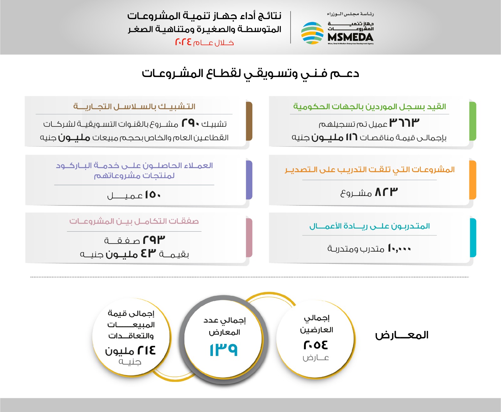 وقال إن الجهاز أسس خلال عام 2024 وحدة تنظيمية جديدة معنية بالتصدير ومسئولة عن تطوير آليات دعم صغار المصدرين أو المصدرين المحتملين من أصحاب المشروعات المتوسطة والصغيرة ومتناهية الصغر لمساعدة أصحاب المشروعات على التسويق والوصول للأسواق الخارجية، فيما تم مضاعفة حجم مبيعات المشروعات الصغيرة المقدمة من خلال الجهاز للمناقصات والتعاقدات الحكومية، وتوقيع العديد من البروتوكولات ومذكرات التفاهم الأفريقية والأوروبية لفتح أسواق هذه الدول أمام منتجات المشروعات المصرية.