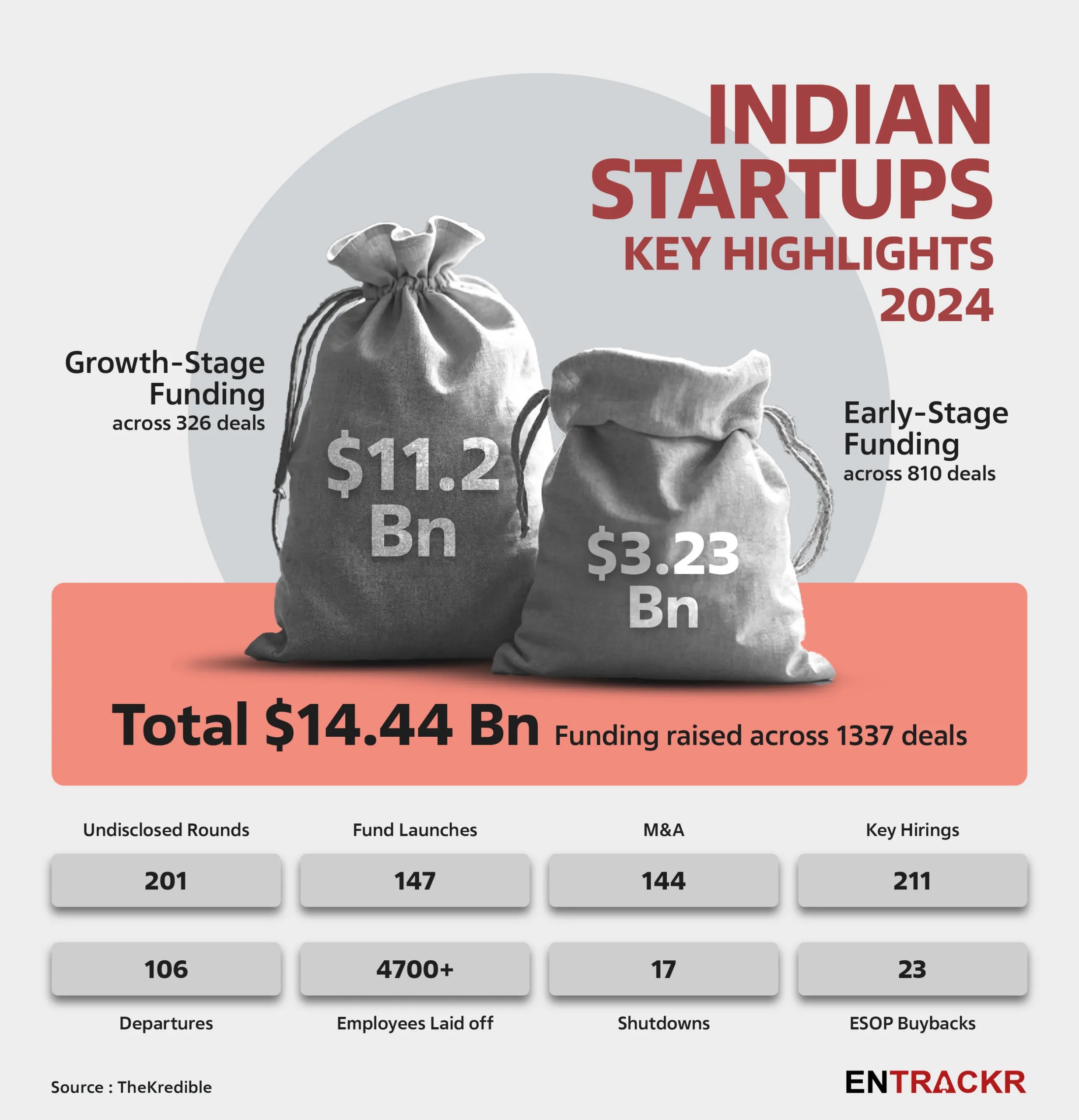 وفقاً لبيانات TheKredible، جمعت الشركات الناشئة الهندية 14.44 مليار دولار عبر 1,337 صفقة تمويل.