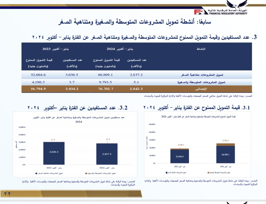 وأضاف أن قيمة التمويلات الممنوحة لصالح المشروعات متناهية الصغر خلال أول 10 أشهر من 2024 نحو 66.909 مليار جنيه، مقابل 52.604 مليار جنيه خلال الفترة المقارنة من 2023، لافتا الى تراجع أعداد المستفيدين ليبلغ عددهم 2.83 مليون مستفيد مقابل 3.03 مليون مستفيد.