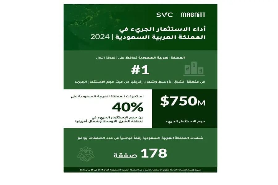 وأكد التقرير الصادر اليوم عن MAGNiTT، منصة بيانات الاستثمار الجريء في الشركات الناشئة، أن المملكة استحوذت على الحصة الأكبر والتي بلغت 40% من إجمالي الاستثمار الجريء في منطقة الشرق الأوسط وشمال إفريقيا في عام 2024.