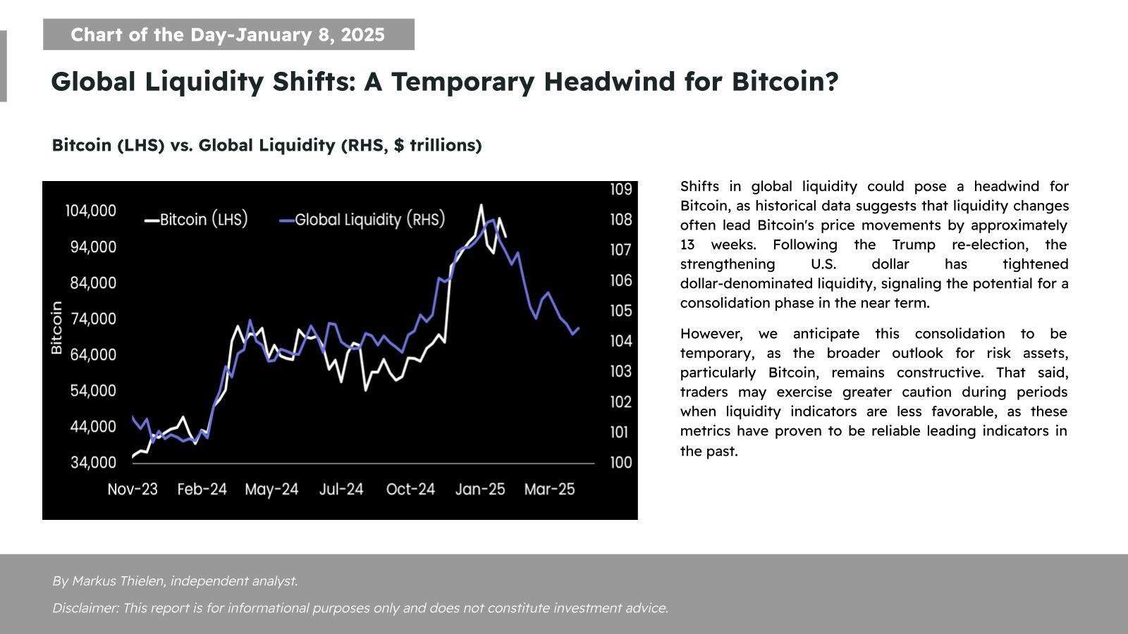 أشار المحلل ماركوس ثيلين إلى أن قوة الدولار الأمريكي، التي تعززت بعد إعادة انتخاب ترامب، تساهم في تشديد السيولة. وأوضح أن التغيرات في السيولة العالمية تؤثر تاريخيًا على سعر البيتكوين بعد حوالي 13 أسبوعًا. ومع تراجع السيولة المقومة بالدولار، قد تدخل البيتكوين مرحلة من التماسك السعري.