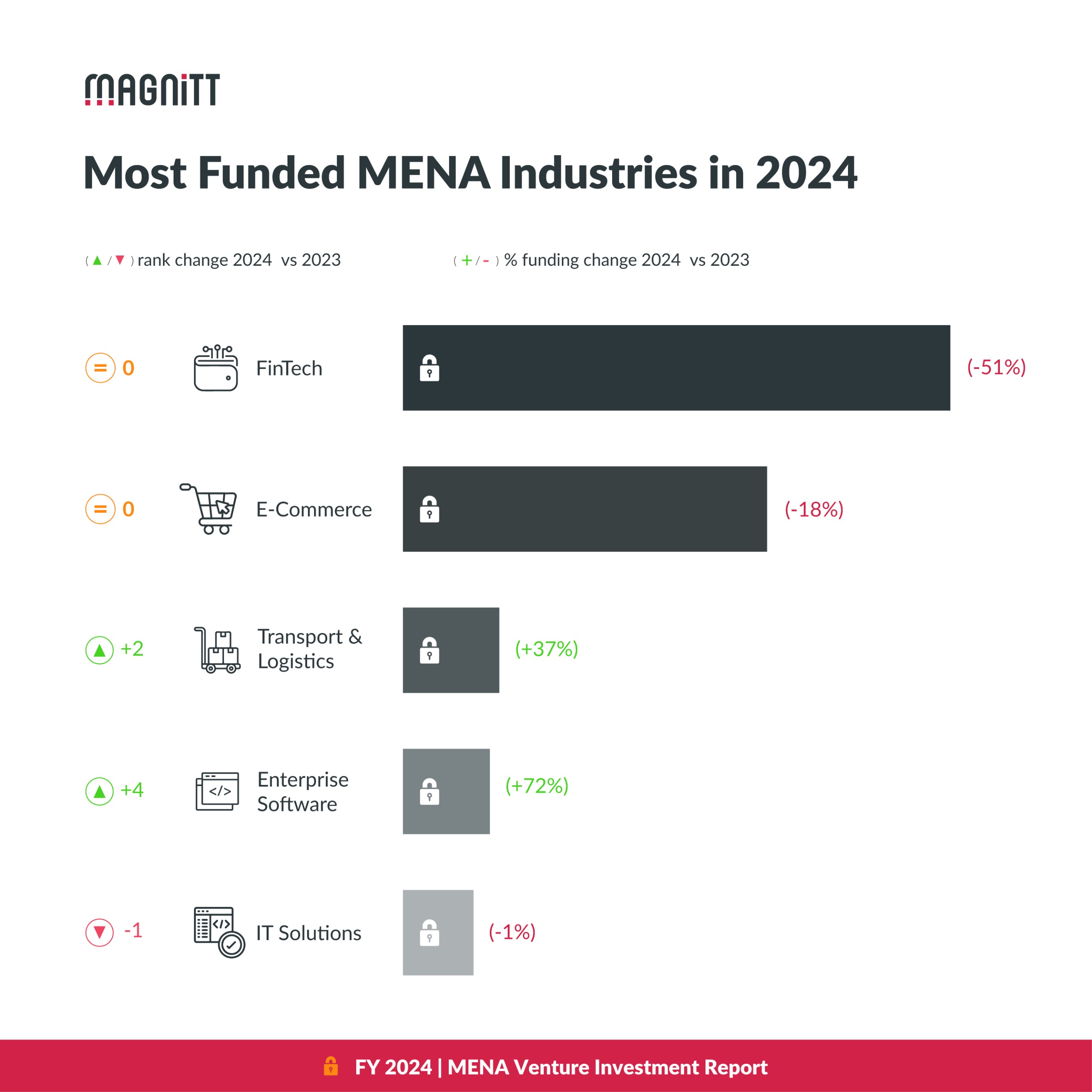 في منطقة الشرق الأوسط وشمال أفريقيا، تواصل صناعة الفنتك تصدر قائمة الصناعات الأكثر جذبًا للاستثمار رغم تراجع التمويل في هذا القطاع بنسبة 51% خلال العام الماضي ليصل إلى 630 مليون دولار. لكن الفنتك لا تزال هي الصناعة الأبرز في المنطقة، حيث تزايدت المنافسة من قبل صناعات ناشئة أخرى مثل النقل واللوجستيات، وبرمجيات المؤسسات، والأطعمة والمشروبات.