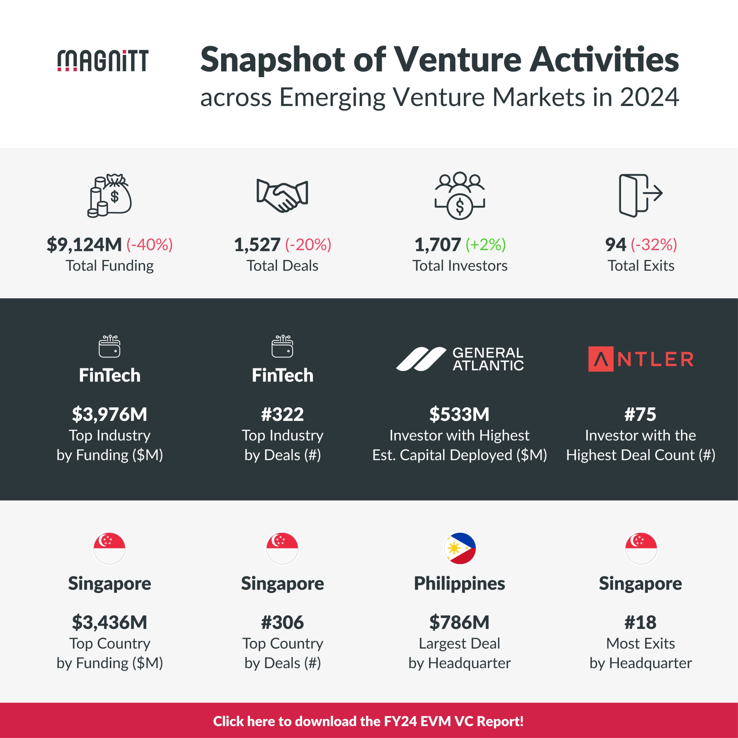 كان عام 2024 عامًا صعبًا على أسواق رأس المال المغامر الناشئة (EVMs)، حيث تراجع حجم التمويل بشكل حاد نتيجة لانخفاض عدد الصفقات وتراجع الإقبال على الاستثمارات، لا سيما في المراحل المتقدمة.