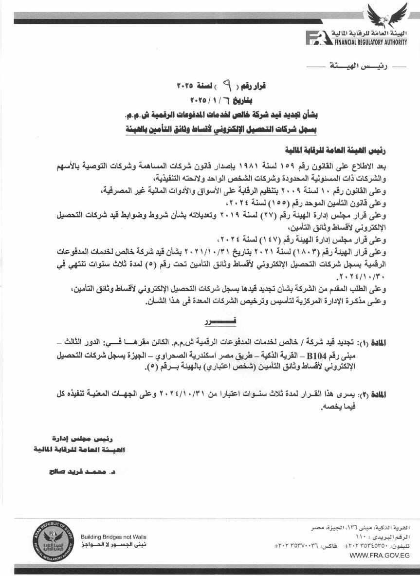 أعلنت الهيئة العامة للرقابة المالية عن تجديد قيد شركة “خالص” لخدمات المدفوعات الرقمية في سجل شركات التحصيل الإلكتروني لأقساط وثائق التأمين.
