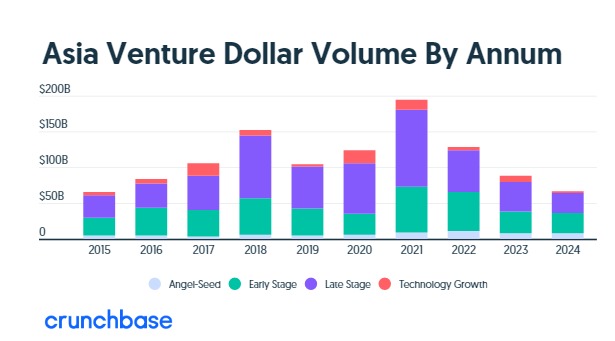 بينما شهد الاستثمار العالمي في رأس المال المغامر انتعاشًا العام الماضي، تعرضت السوق الآسيوية لهبوط حاد، حيث بلغ إجمالي التمويل في عام 2024 نحو 65.8 مليار دولار فقط، وهو نفس المستوى الذي سجلته السوق في عام 2014.