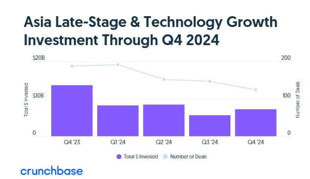 بينما شهد الاستثمار العالمي في رأس المال المغامر انتعاشًا العام الماضي، تعرضت السوق الآسيوية لهبوط حاد، حيث بلغ إجمالي التمويل في عام 2024 نحو 65.8 مليار دولار فقط، وهو نفس المستوى الذي سجلته السوق في عام 2014.