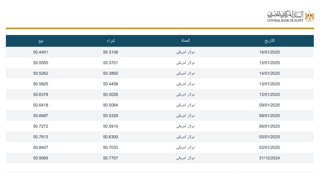 في الثاني من يناير 2025، بلغ سعر الدولار 50.7033 جنيهًا للشراء و 50.8407 جنيهًا للبيع، ليشهد تراجعًا تدريجيًا في الأيام التالية. وفي الخامس من يناير 2025، انخفض السعر إلى 50.6300 جنيهًا للشراء و 50.7613 جنيهًا للبيع، قبل أن يسجل مزيدًا من التراجع في السادس من يناير، حيث وصل إلى 50.5915 جنيهًا للشراء و 50.7272 جنيهًا للبيع.
