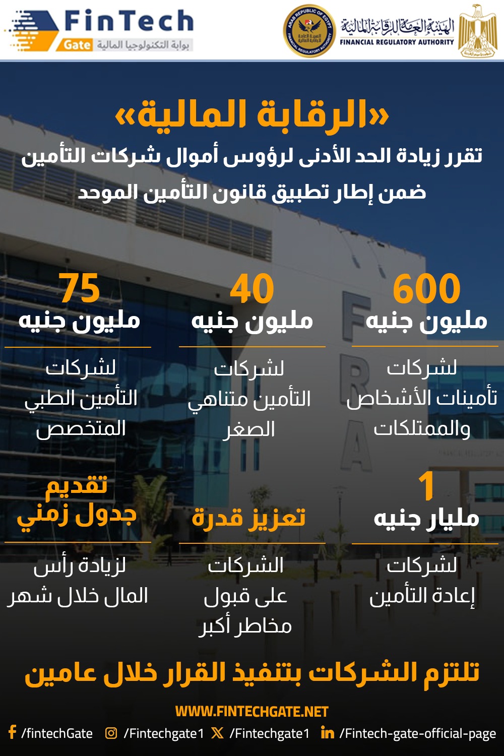 كما ألزم القرار باقي الشركات المخاطبة بالقرار بتوفيق أوضاعها خلال سنة من تاريخ العمل به، حيث تم وضع الحد الأدنى لرأس مال شركات التأمين متناهي الصغر بقيمة 40 مليون جنيه، كما وضع القرار حداً أدنى لرأس مال شركات التأمين المتخصصة في إحدى فروع التأمين بقيمة 75 مليون جنيه، وحدد القرار الحد الأدنى لرأس مال شركات التأمين الطبي المتخصصة بقيمة 75 مليون جنيه، فيما تم تحديد الحد الأدنى لرأس مال شركات إعادة التأمين بقيمة مليار جنيه.