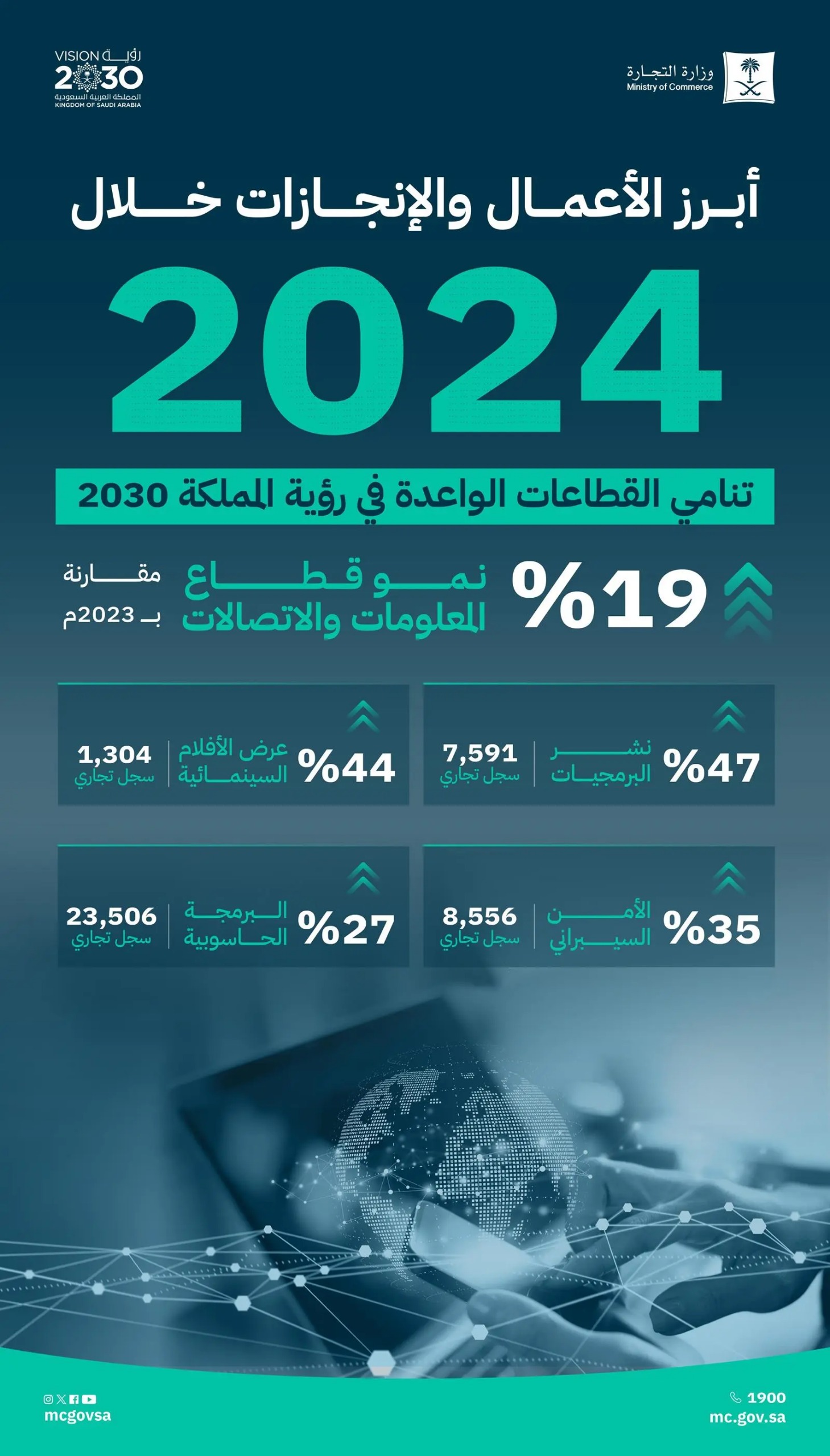 أعلنت وزارة التجارة السعودية عن تنامي السجلات التجارية في قطاع المعلومات والاتصالات بنسبة 19% خلال العام 2024م مقارنة بالعام 2023.
