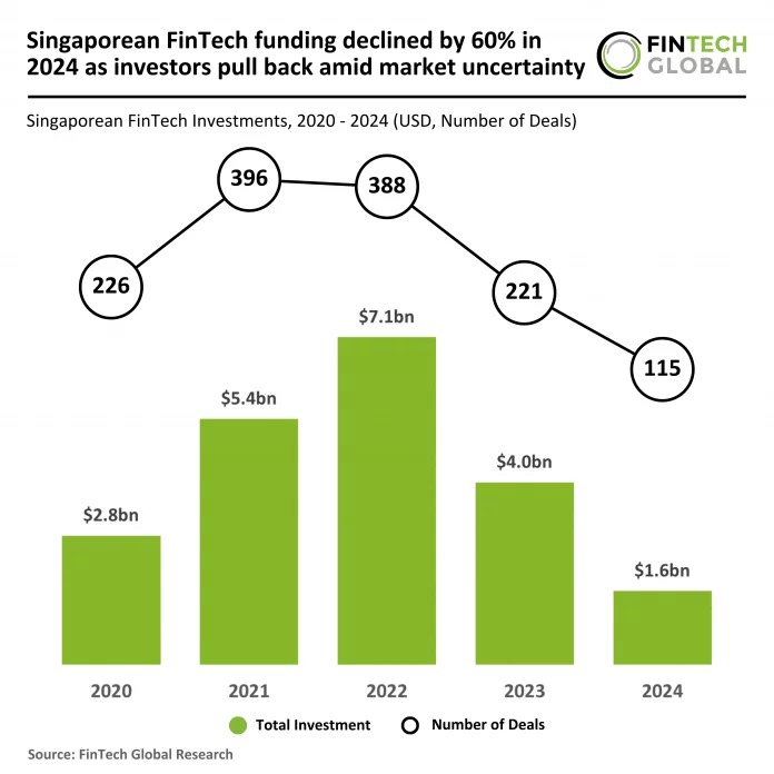 وفي عام 2024، شهد قطاع التكنولوجيا المالية في سنغافورة انخفاضًا كبيرًا في كل من الأنشطة والتمويل مقارنة بالسنوات السابقة، حيث تم تسجيل 115 صفقة فقط في 2024، بانخفاض نسبته 48% عن 221 صفقة تمت في 2023، و49% أقل من 226 صفقة تم تنفيذها في 2020، يمثل ذلك أقل عدد من الصفقات في آخر خمس سنوات، مما يبرز تباطؤ النشاط في القطاع.