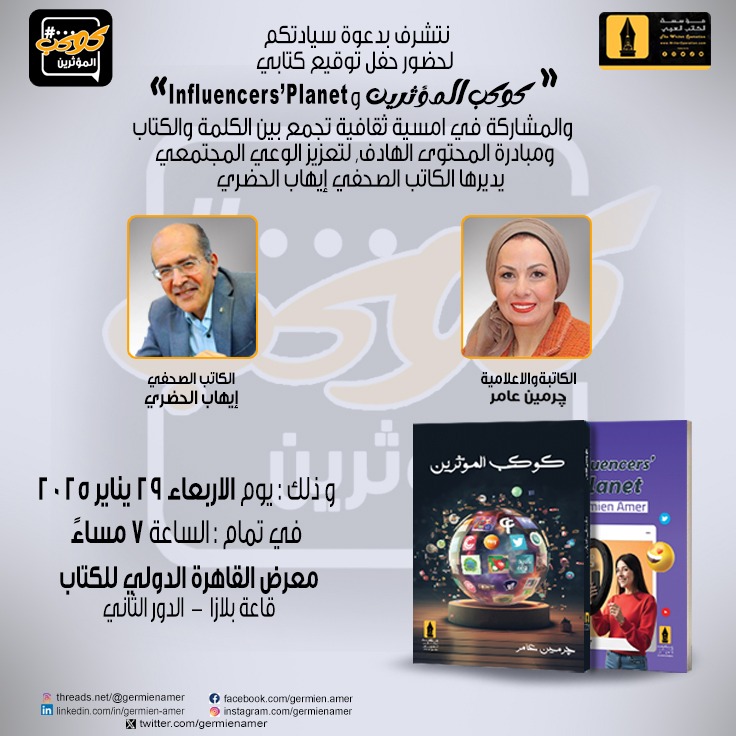 تقام بعد غدا /الأربعاء/ندوة لمناقشة كتاب “كوكب المؤثرين” بنسختيه العربية والانجليزية للكاتبة چرمين عامر – عضو اتحاد الاعلاميين العرب علي هامش فاعليات معرض القاهرة الدولي للكتاب – النسخته ال56،في تمام الساعة السابعة مساء يدير الندوة الكاتب الصحفي ايهاب الحضري – مدير تحرير جريدة الاخبار.