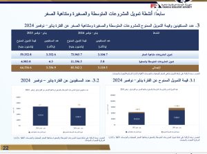 وأضاف أن قيمة التمويلات الممنوحة لصالح المشروعات متناهية الصغر خلال أول 11 شهر من 2024 نحو 73.965 مليار جنيه، مقابل 59.352 مليار جنيه خلال الفترة المقارنة من 2023، لافتا الى تراجع أعداد المستفيدين ليبلغ عددهم 3.104 مليون مستفيد مقابل 3.352 مليون مستفيد.