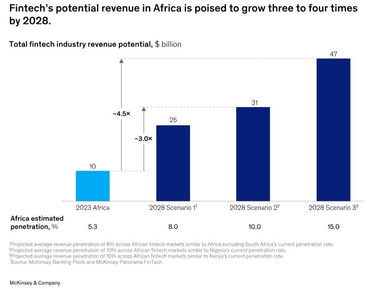 تشير تحليلات ماكينزي إلى أن إيرادات التكنولوجيا المالية في أفريقيا قد تصل إلى 47 مليار دولار بحلول عام 2028، وهو ما يمثل زيادة بخمسة أضعاف مقارنة مع قيمتها البالغة 10 مليار دولار في عام 2023.