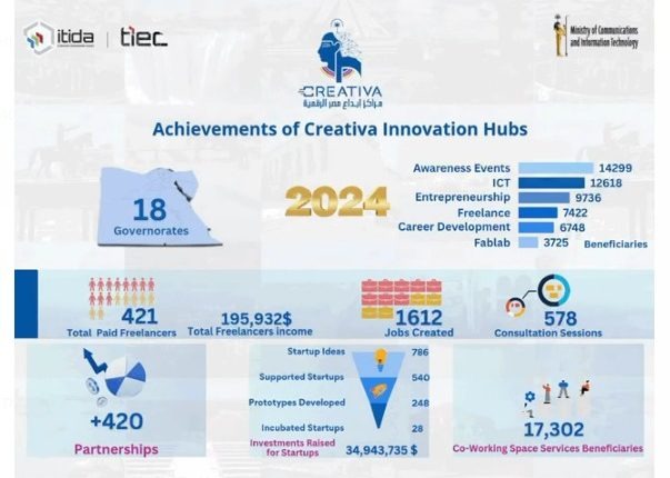 وأوضحت “كريتيفا” فى تقريرها السنوي أنه تم دعم أكثر من 55 ألف مستفيد في مجالات ريادة الأعمال، التكنولوجيا، والعمل الحر، حيث تم تنظيم 14,299 فعالية توعوية واستفاد منها الآلاف من الشباب والمطورين في مختلف المجالات.