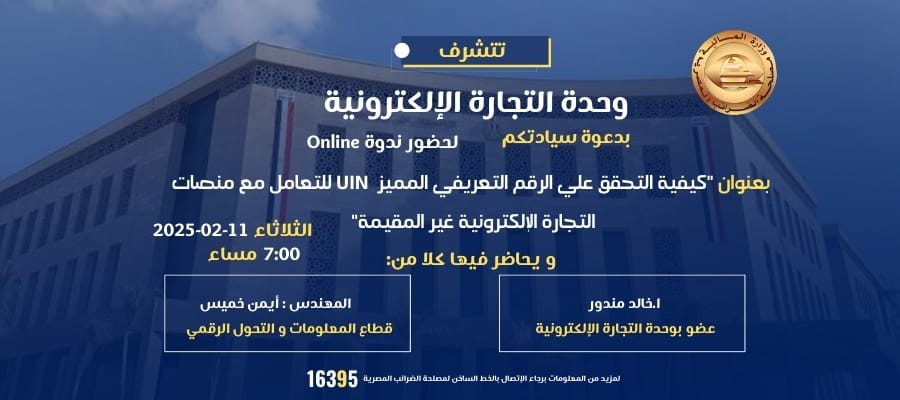 تنظم وحدة التجارة الإلكترونية بمصلحة الضرائب المصرية ندوة غدًا في تمام الساعة السابعة مساءً، لمناقشة آليات التحقق من الرقم التعريفي المميز (UIN) عند التعامل مع منصات التجارة الإلكترونية غير المقيمة.