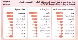كانت الفئات الأعلى طلبًا لهدايا عيد الحب في منطقة الشرق الأوسط وشمال أفريقيا هي الأزياء (20%)، تليها مستلزمات المنزل والحديقة (18.5%)، ثم الإلكترونيات (17.5%)، ومنتجات التجميل (9%)، ومنتجات السيارات (7%)، والأدوات (6%).