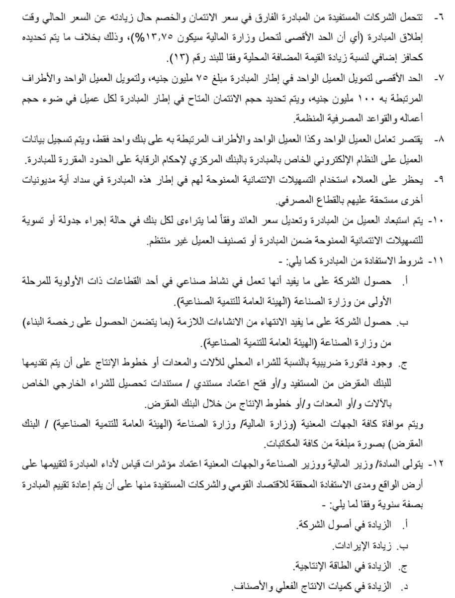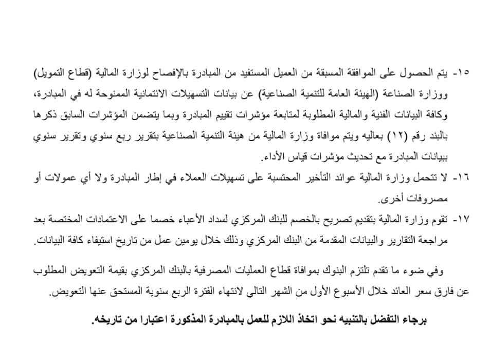3- توجيه المبلغ المخصص في إطار المبادرة إلى القطاعات الصناعية ذات الأولوية المحددة وفقا للقرارات الصادرة عن الاجتماع السادس للمجموعة الوزارية للتنمية الصناعية برئاسة السيد الدكتور رئيس مجلس الوزراء بتاريخ ١٢/ ۲۰۲٤/٩ (مرفق قائمة بالصناعات ذات الأولوية وذلك بالعملة المحلية للعملاء من القطاع الخاص المنتظمين، شريطة الحصول على كتاب من الهيئة العامة للتنمية الصناعية بذلك على أن تقوم الهيئة بموافاة البنوك المشاركة بخطاب بصورة مبلغة لوزارة المالية يفيد بأن نشاط العميل يندرج ضمن القطاعات الصناعية ذات الأولوية وعلى أن تقوم وزارة الصناعة الهيئة العامة للتنمية الصناعية بموافاة البنك المعني بكتاب يفيد استيفاء العميل للاشتراطات الفنية للحصول على المبادرة والمذكورة في البند (۱۱).