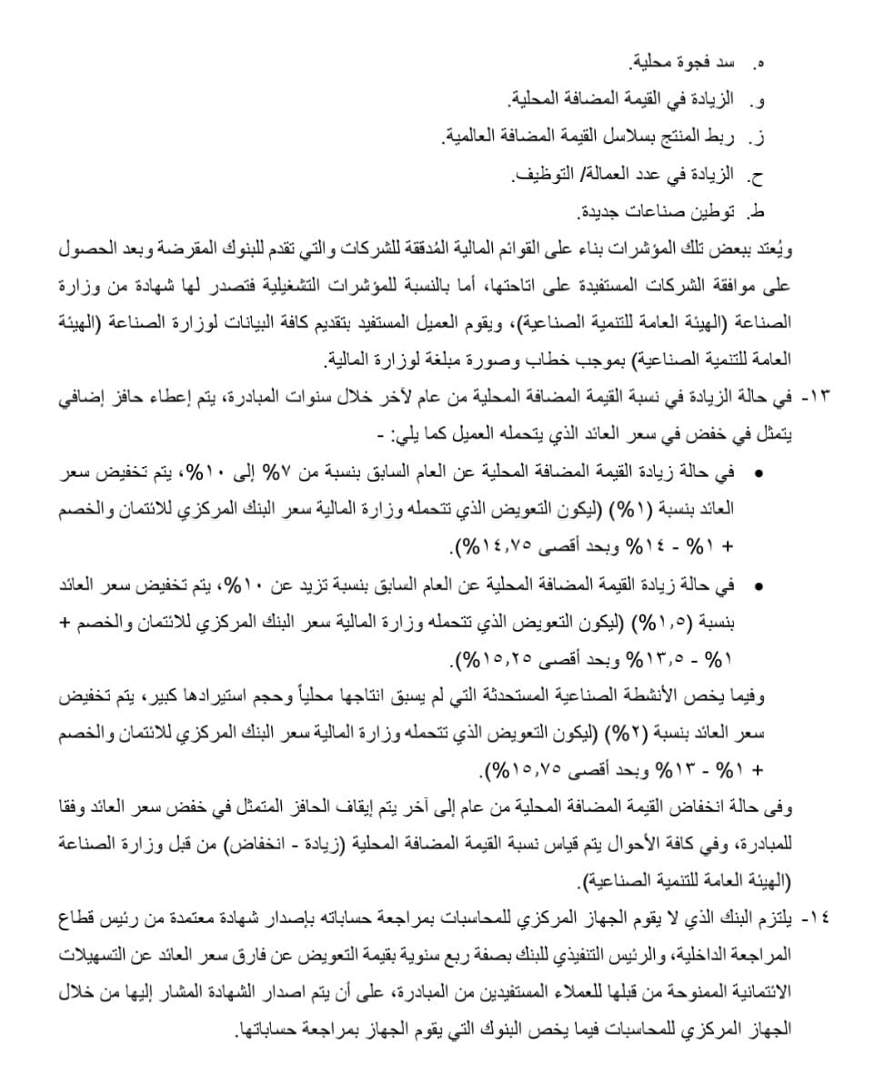 . في حالة زيادة القيمة المضافة المحلية عن العام السابق بنسبة تزيد عن ١٠% ، يتم تخفيض سعر العائد بنسبة (١,٥%) ليكون التعويض الذي تتحمله وزارة المالية سعر البنك المركزي للائتمان والخصم + %1 – ١٣,٥ وبحد أقصى ١٥,٢٥%).