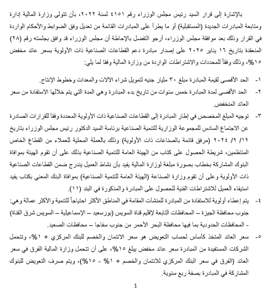 بالإشارة إلى قرار السيد رئيس مجلس الوزراء رقم ٤١٥١ لسنة ۲۰۲۲ ، بأن تتولى وزارة المالية إدارة ومتابعة المبادرات الجديدة (المستقبلية) أو ما يطرأ على المبادرات القائمة من تعديل وفق الضوابط والأحكام الواردة في القرار وذلك بعد موافقة مجلس الوزراء، أرجو التفضل بالإحاطة أن مجلس الوزراء قد وافق بجلسته رقم (۲۸) المنعقدة بتاريخ ١٦ يناير ۲۰۲۵ على إصدار مبادرة دعم القطاعات الصناعية ذات الأولوية بسعر عائد مخفض ١٥%، وذلك وفقاً للمحددات والاشتراطات الواردة من وزارة المالية وفقا لما يلي: