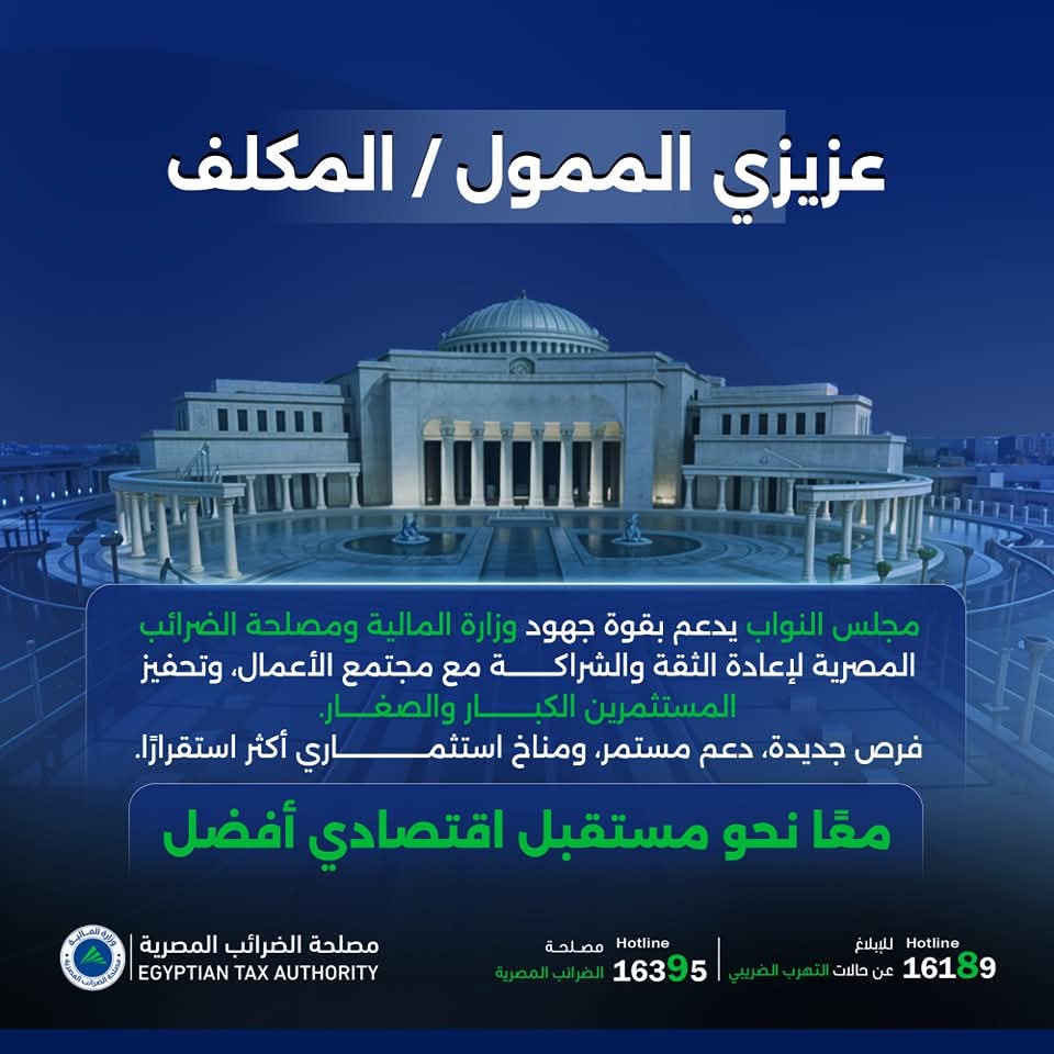أعرب مجلس النواب عن دعمه الكامل لجهود وزارة المالية ومصلحة الضرائب المصرية في تعزيز الثقة والشراكة مع مجتمع الأعمال، من خلال تقديم تسهيلات ضريبية جديدة تهدف إلى تحفيز الاستثمار، ودعم المستثمرين الكبار والصغار، وتهيئة مناخ استثماري أكثر استقرارًا ووضوحًا.