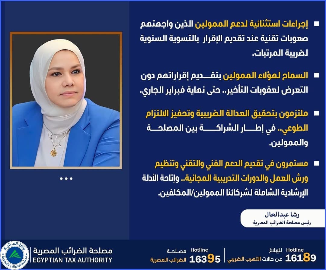 وتأتي هذه الخطوة في إطار التزام المصلحة بـتحقيق العدالة الضريبية، وتعزيز الالتزام الطوعي، ودعم مجتمع الأعمال، مع الاستمرار في تقديم الدعم الفني والتقني، وتنظيم ورش العمل والدورات التدريبية المجانية، وإتاحة الأدلة الإرشادية الشاملة لمساعدة الممولين في الامتثال بسهولة.