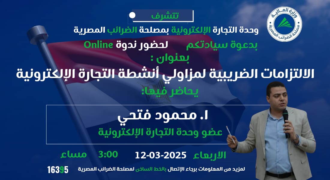 في إطار جهود وحدة التجارة الإلكترونية بمصلحة الضرائب المصرية لتعزيز الوعي الضريبي بين مزاولي الأنشطة الرقمية، تنظم الوحدة ندوة توعوية بعنوان “الالتزامات الضريبية لمزاولي أنشطة التجارة الإلكترونية”، يوم الأربعاء 12 مارس 2025 في تمام الساعة 3 مساءً.