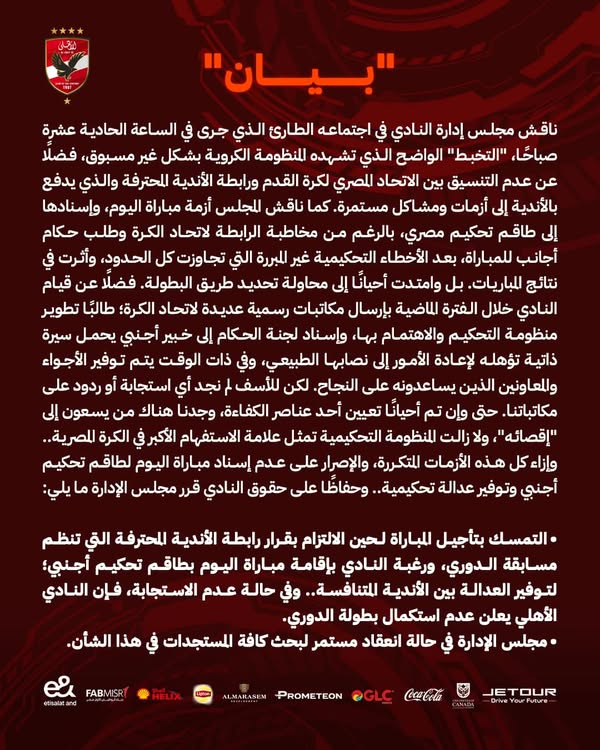وأكد البنك أنه طالب في مكاتبات عديدة باصلاح منظومة التحكيم في مصر التي باتت علامة استفاهم كبيرة وتؤثر في نتائج المباريات وتوجيه بطولة الدوري، معلنا انسحابه من الدوري وعدم استكماله حال عدم الاستجابة لمطالبه باصلاح منظومة التحكيم