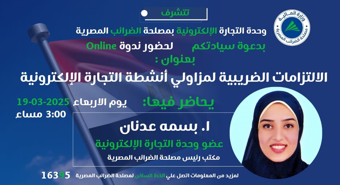 تعقد وحدة التجارة الإلكترونية بمصلحة الضرائب المصرية ندوة أونلاين بعنوان “الالتزامات الضريبية لمزاولي أنشطة التجارة الإلكترونية” يوم الأربعاء 19 مارس 2025، الساعة 3:00 مساءً، وتحاضر فيها الأستاذة بسمة عدنان.