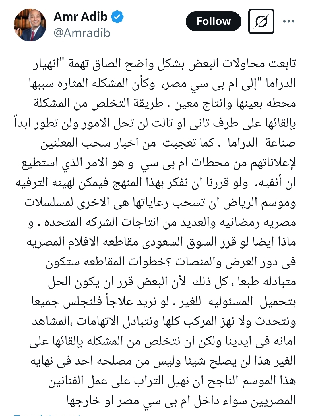 الصفحة الرئيسية أخباربعد إتهام «mbc» بأنها سبب إنهيار الدراما ونشر البلطجة..«عمرو أديب» يهدد بسحب الرعايات السعودية من المسلسلات المصرية