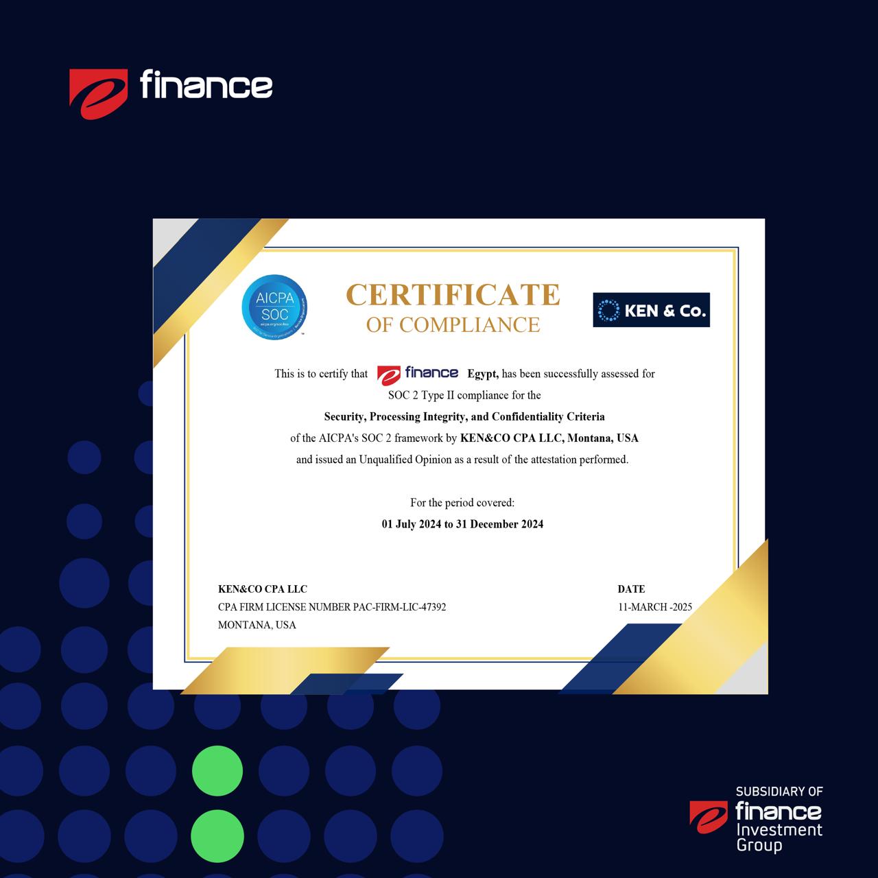 وصرح إبراهيم سرحان رئيس مجلس الإدارة والعضو المنتدب لمجموعة “إي فاينانس”، بأن اجتياز تدقيق SOC2 Type2 يمثل دليلًا على التزام شركة “إي فاينانس” المستمر بالحفاظ على أعلى معايير الأمان وحماية البيانات وسلامة المعلومات، لجميع العملاء سواء في القطاعات البسيطة أو في جميع القطاعات الحيوية الأكثر أهمية حيث الثقة والأمان يشملان الجميع بشكل شامل ودائم ومستمر ومتطور أيضاً بما يواكب دائماً أحدث آليات الحماية العالمية.