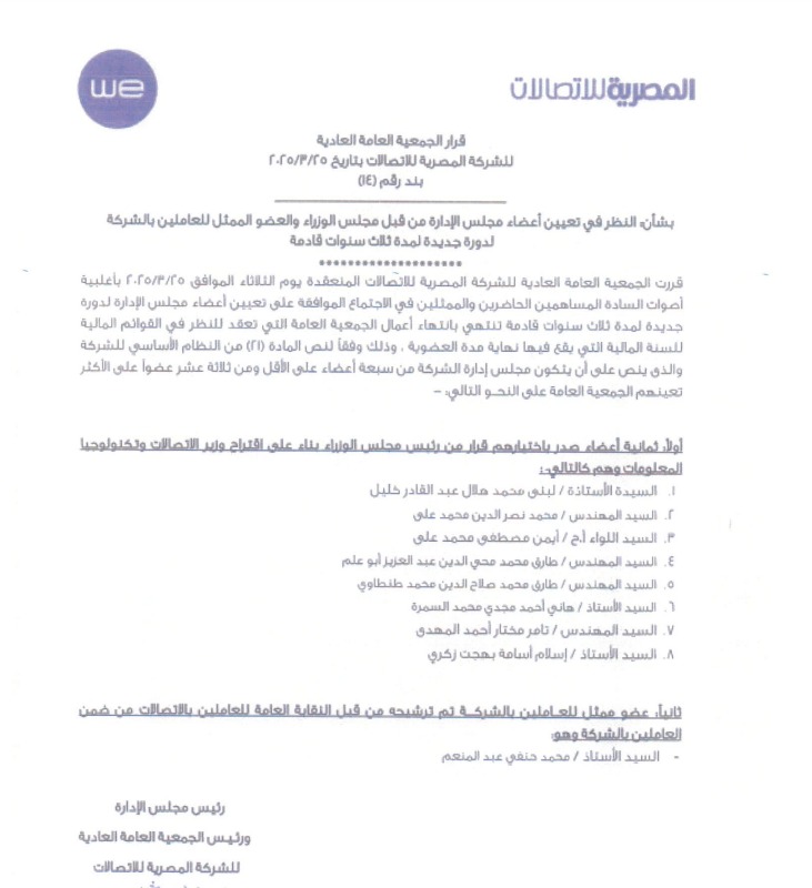 أعلنت الشركة المصرية للاتصالات اليوم تعيين أعضاء مجلس الإدارة لدورة جديدة لمدة 3 سنوات قادمة، وضم التشكيل لبنى هلال (رئيس المجلس)، ومحمد نصر الدين (الرئيس التنفيذى و العضو المنتدب)، وأيمن مصطفى، وطارق أبو علم، وطارق طنطاوي، وهاني السمرة، وتامر المهدي، وإسلام أسامة بهجت زكري، وممثلًا عن النقابة العامة للعاملين بالشركة وهو محمد حنفي عبد المنعم و أربعة أعضاء مستقلين محمد كمال الدين بركات، وجرجس ثروت جرجس عبد الشهيد، وعاطف عبد اللطيف المغربي، وحسام عبد الحميد سيف الدين.