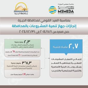 صرح باسل رحمي الرئيس التنفيذي لجهاز تنمية المشروعات المتوسطة والصغيرة ومتناهية الصغر بأن الجهاز قام بضخ تمويلات لدعم قطاع المشروعات في محافظة الجيزة خلال الفترة من يوليو 2014 وحتى نهاية ديسمبر 2024 بإجمالي 2.7 مليار جنيه منها 2.3 مليار جنيه مولت حوالي 60 ألف مشروع صغير ومتناهي الصغر أتاحت نحو 100 ألف فرصة عمل، بالإضافة إلى 361.3 مليون جنيه لمشروعات البنية الأساسية والتنمية المجتمعية والتدريب وفرت حوالي 1.7 مليون يومية عمل.