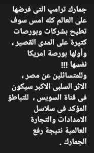 وأضاف، في منشور عبر صفحته الرسمية على موقع فيسبوك، أن فرض هذه الرسوم ستؤثر سلبًا على قناة السويس، مشيرا إلى أن هذه الإجراءات ستؤدي إلى تباطؤ حتمي في سلاسل الإمداد والتجارة العالمية بسبب ارتفاع التكاليف الجمركية.