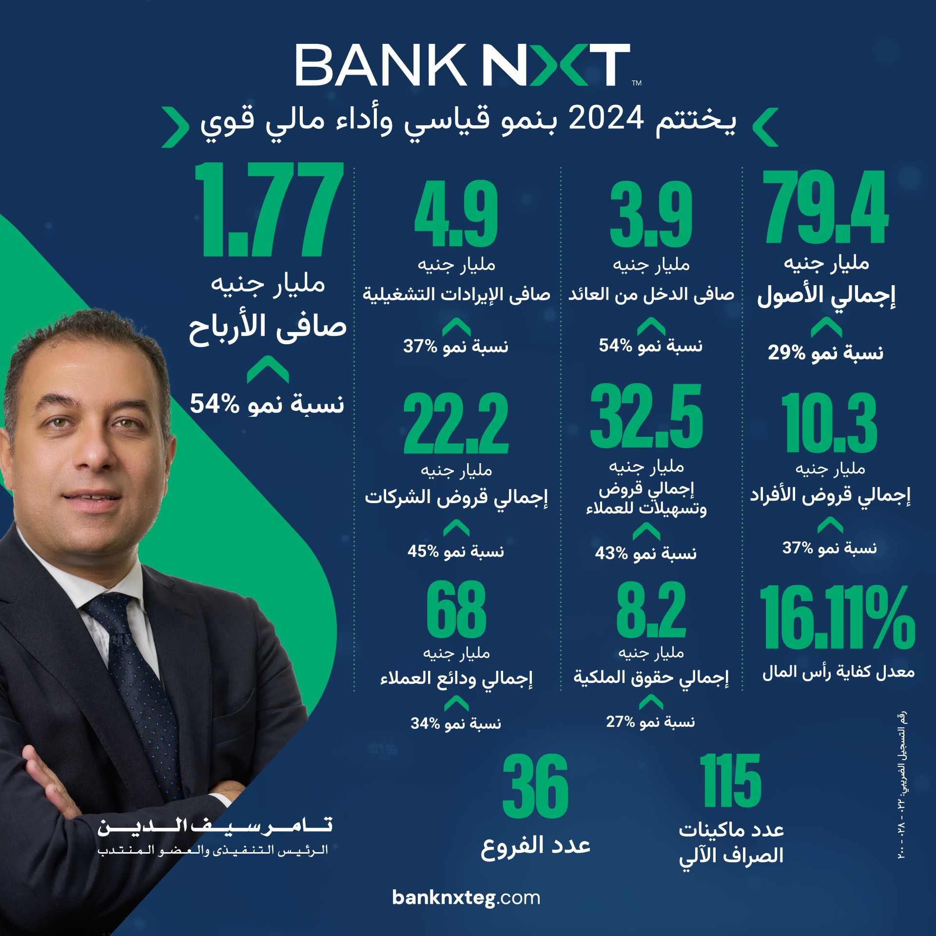 وقد أعرب تامر سيف الدين، الرئيس التنفيذي والعضو المنتدب لبنك نكست، عن اعتزازه بالأداء المتميز للبنك خلال عام 2024 الذي يعكس مردود التوسع بباقة المنتجات والخدمات التي يقدمها وتم إتاحتها لشريحة واسعة من العملاء في مختلف أنحاء الجمهورية. هذا وقد أشاد سيف الدين بجهود فريق العمل بالبنك
