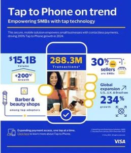 تقنية “Tap to Phone” من «Visa» توسع قدرات الدفع اللاتلامسي عبر تمكين الهواتف الذكية لتصبح نقاط بيع (POS) ببساطة من خلال تحميل تطبيق مخصص. ومن بين البائعين الذين اعتمدوا هذه التقنية، يشكل حوالي 30% منهم شركات جديدة، مما يسهم في تمكين البائعين الصغار والمتاجر الصغيرة من قبول المدفوعات اللاتلامسية باستخدام هواتفهم الذكية المجهزة بتقنية NFC.