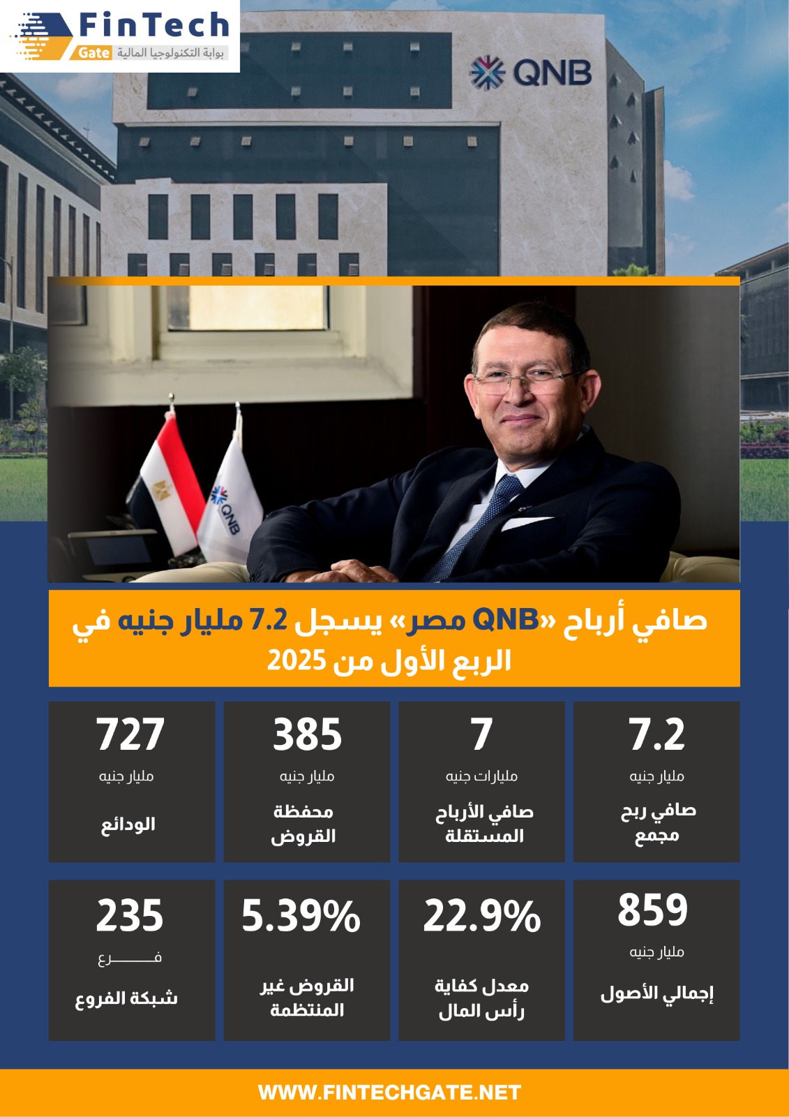 أعلن QNB مصر نتائج أعماله المستقلة والمجمعة عن الربع الأول من العام الحالي 2025 (يناير – مارس 20258) الفترة المالية المنتهية في مارس 2025 جيث زادت محفظة القروض والسلفيات 21 مليار جنيه مصري لتصل إجمالاً إلى 385 مليار جنيه مصري وبما يمثل نمواً قدره 6% مقارنة بديسمبر 2024.