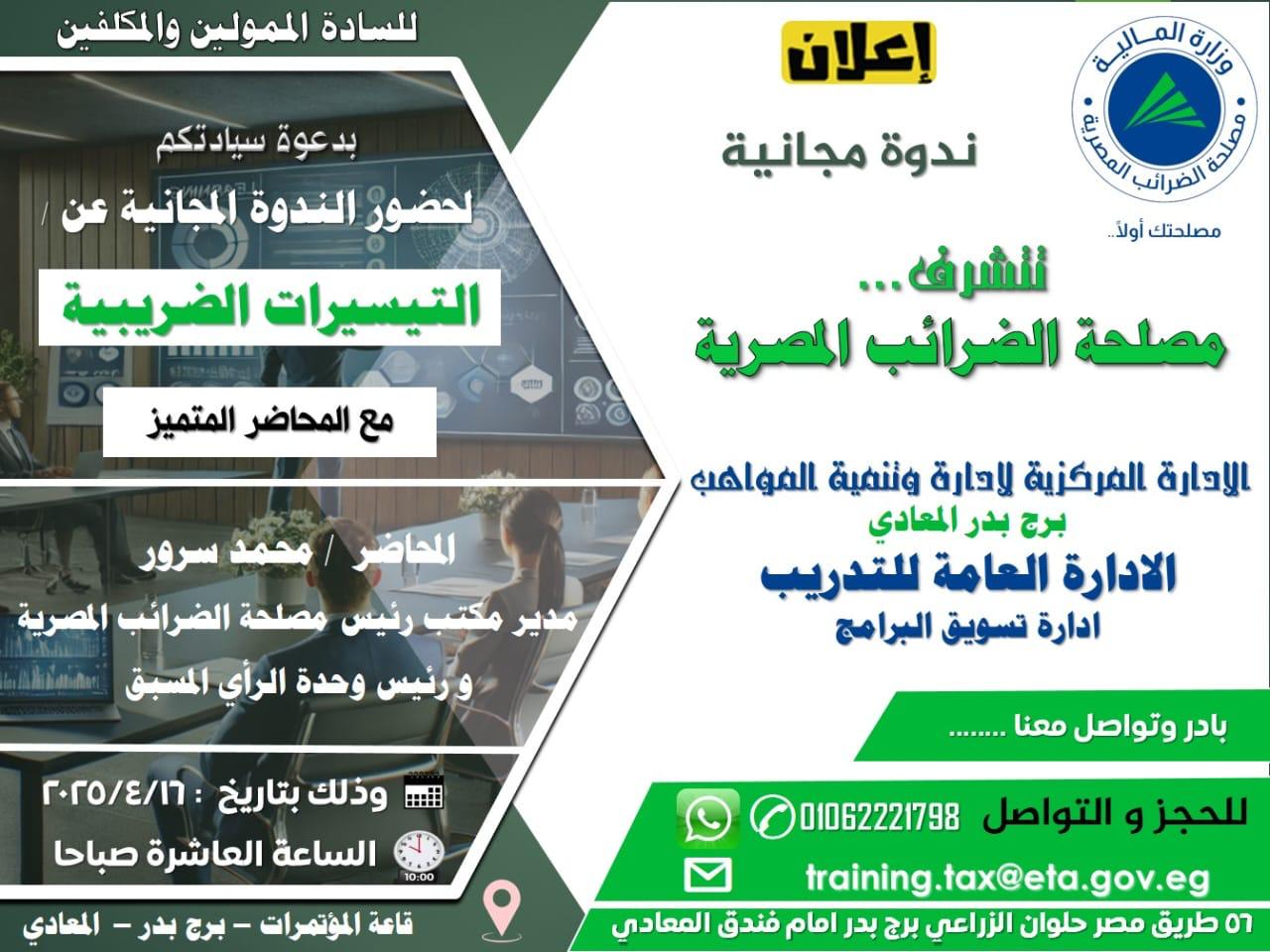في إطار جهودها المستمرة للتوعية الضريبية ودعم الممولين، تنظم مصلحة الضرائب المصرية ندوة مجانية بعنوان “التيسيرات الضريبية”، وذلك يوم الأربعاء الموافق 16 أبريل 2025، في تمام الساعة العاشرة صباحًا، بقاعة المؤتمرات في برج بدر – المعادي.