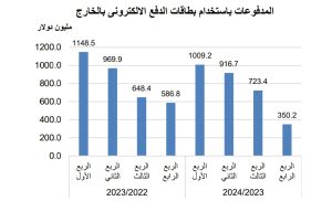 وكانت المدفوعات قد سجلت ذروتها خلال الربع الأول من العام المالي 2022/2023، لتصل إلى نحو 1148.5 مليون دولار، قبل أن تبدأ في التراجع التدريجي خلال الفترات التالية؛ إذ سجلت 969.9 مليون دولار في الربع الثانى، ثم 648.4 مليون دولار في الربع الثالث، و586.8 مليون دولار في الربع الرابع من نفس العام.