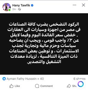 وأوضح «هاني توفيق» عبر منشور له على منصات التواصل الاجتماعي، أن خفض الفائدة يجب أن يتزامن مع تبني سياسات وحزم مالية وتجارية واضحة تساهم في جذب الاستثمارات وتوطين بعض الصناعات التي تتمتع بميزة تنافسية، بهدف دفع عجلة التشغيل وزيادة معدلات التصدير.