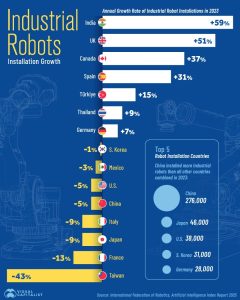 واحتلت الصين الصدارة عالميًا، بعدما قامت بتركيب أكثر من 276 ألف روبوت صناعي جديد في مصانعها خلال عام 2023 وحده، بينما سجلت الهند معدل النمو السنوي الأسرع على مستوى العالم بنسبة قفزت إلى 59%، أي ما يعادل تركيب 8,510 روبوتات جديدة في عام واحد، مدفوعة بازدهار قطاع السيارات داخل البلاد.