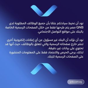 الرئيسية » بنك «QNB مصر» يحذر من إعلانات الوظائف الوهمية ويؤكد: التقديم متاح فقط عبر الصفحات الرسمية