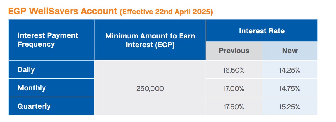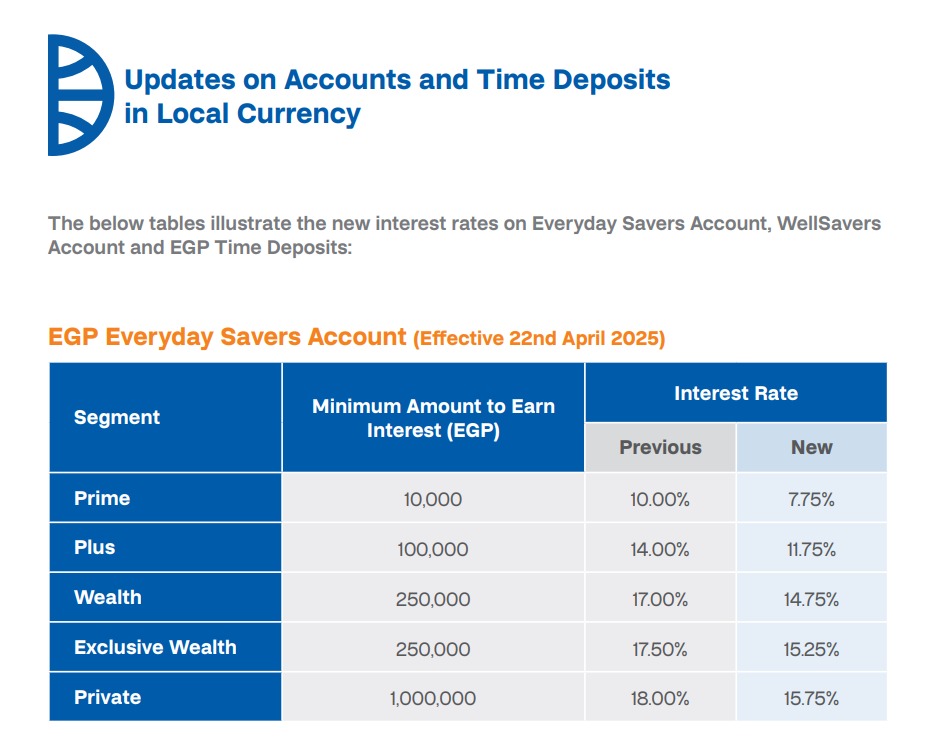 وفيما يخص التعديلات على أسعار الفائدة، فقد تم تعديل الفائدة على حساب التوفير Everyday Savers حيث تم تخفيض سعر الفائدة على حسابات الفئة الرئيسية (Prime) من 10.00% إلى 7.75% للرصيد الذي لا يقل عن 10,000 جنيه، كما تم تعديل سعر الفائدة على حسابات فئة البلس (Plus) من 14.00% إلى 11.75% للرصيد الذي لا يقل عن 100,000 جنيه.