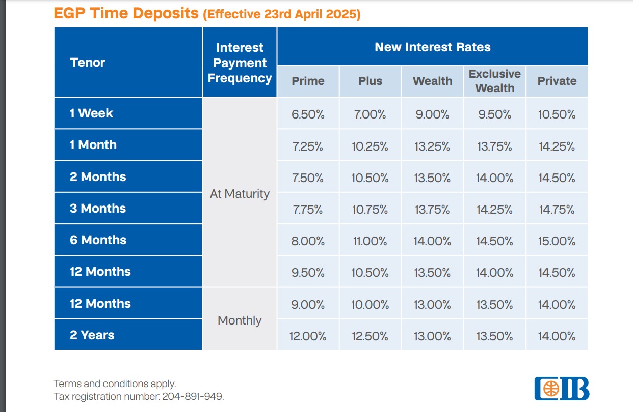 أعلن البنك التجاري الدولي – مصر (CIB) عن تحديثات جديدة على أسعار الفائدة الخاصة بالودائع لأجل بالجنيه المصري، والتي ستسري اعتبارًا من 23 أبريل 2025. وتشمل التعديلات الجديدة على أسعار الفائدة مختلف فئات الودائع وفقًا لآجال استحقاق الوديعة، مع تقديم أسعار فائدة تنافسية تلبي احتياجات عملاء البنك في فئات «Prime»، «Plus»، «Wealth»، «Exclusive Wealth»، و«Private».
