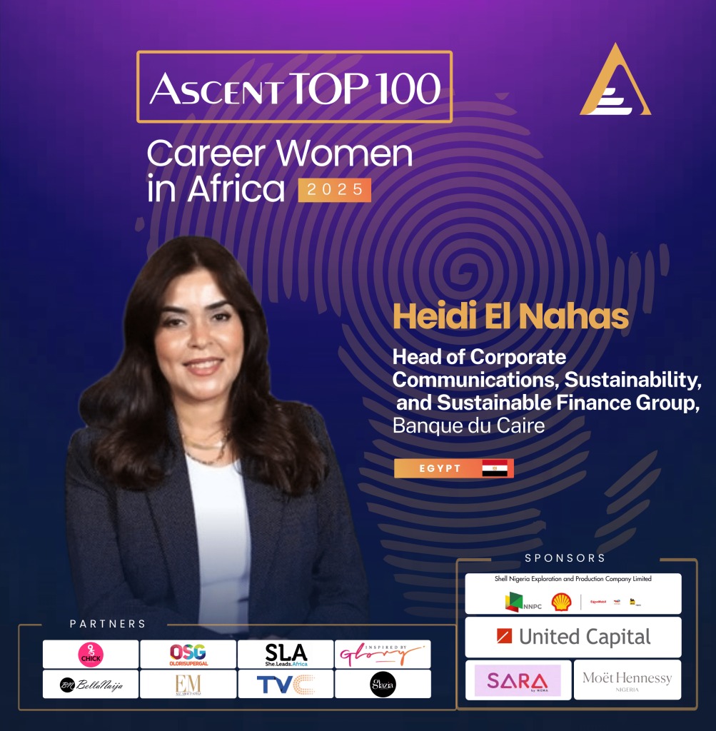في إنجاز جديد يسلط الضوء على مكانة الكفاءات النسائية المصرية على الساحة الإقليمية.. أعلنت مؤسسة «Ascent Club» عن اختيار «هايدي النحاس»، رئيس قطاع الاتصال المؤسسي والاستدامة والتمويل المستدام ببنك القاهرة ضمن قائمة «أقوى 100 سيدة قيادية في أفريقيا لعام 2025» – «2025 Top 100 Career Women In Africa»، تكريمًا لإسهاماتها المتميزة في قيادة جهود الاستدامة والتطوير المؤسسي داخل القطاع المصرفي.