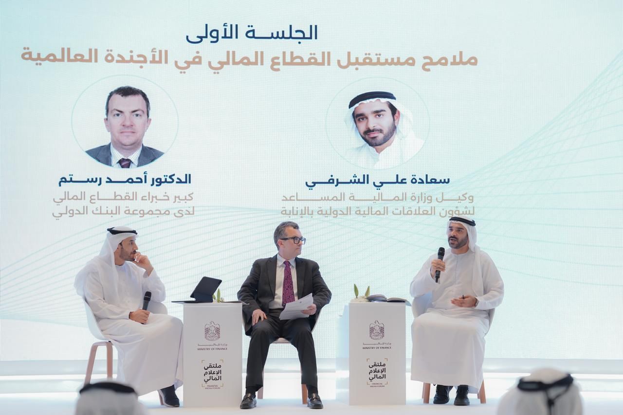 وشهد الملتقى، الذي استُهل بعرض مرئي بعنوان “تخيل.. مستقبل القطاع المالي”، أربع جلسات حوارية استعرضت أبرز القضايا الراهنة والتوجهات المستقبلية في القطاع المالي، بمشاركة نخبة من المتحدثين والمسؤولين من الجهات الاتحادية والمحلية والمؤسسات الإعلامية، حيث كانت أولى الجلسات بعنوان “ملامح مستقبل القطاع المالي في الأجندة العالمية”، وجمعت علي عبد الله الشرفي، الوكيل المساعد لشؤون العلاقات المالية الدولية بالإنابة في وزارة المالية، والدكتور أحمد رستم كبير خبراء القطاع المالي لدى البنك الدولي، وتمحورت الجلسة حول التأثير المتنامي للتوجهات المالية العالمية على السياسات المحلية، وسلطت الضوء على الدور المحوري للمؤسسات الدولية في دعم التحولات المالية الإقليمية، بالإضافة إلى رؤية وزارة المالية لمستقبل العلاقات المالية الدولية، وما تتيحه هذه التحولات من فرص وتحديات للقطاع المالي الإماراتي.