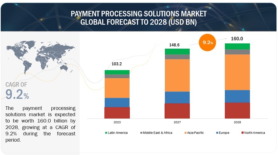 كشفت شركة الأبحاث العالمية «MarketsandMarkets» في تقرير حديث أن سوق حلول معالجة المدفوعات يشهد نموًا متسارعًا، إذ يُتوقع أن يرتفع حجمه من 103.2 مليار دولار في عام 2023 إلى 160.0 مليار دولار بحلول 2028، بمعدل نمو سنوي مركب يبلغ 9.2%.