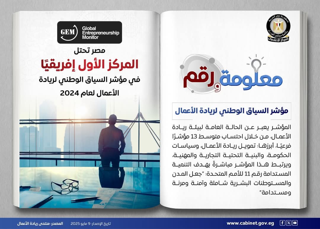 أوضح المركز الإعلامي لمجلس الوزراء أن مصر تصدرت قارة إفريقيا في مؤشر “السياق الوطني لريادة الأعمال” لعام 2024، محققة إجمالي 4.2 نقطة.