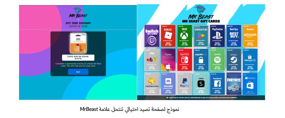 صمم المجرمون السيبرانيون صفحات تصيّد احتيالي تقدم «هدايا مجانية باسم MrBeast»، تشمل بطاقات هدايا رقمية لمنصات Roblox وXbox وPlayStation. فيطلب الموقع من المستخدمين اختيار هديتهم وتنفيذ مهمة تبدو بسيطة للحصول عليها.